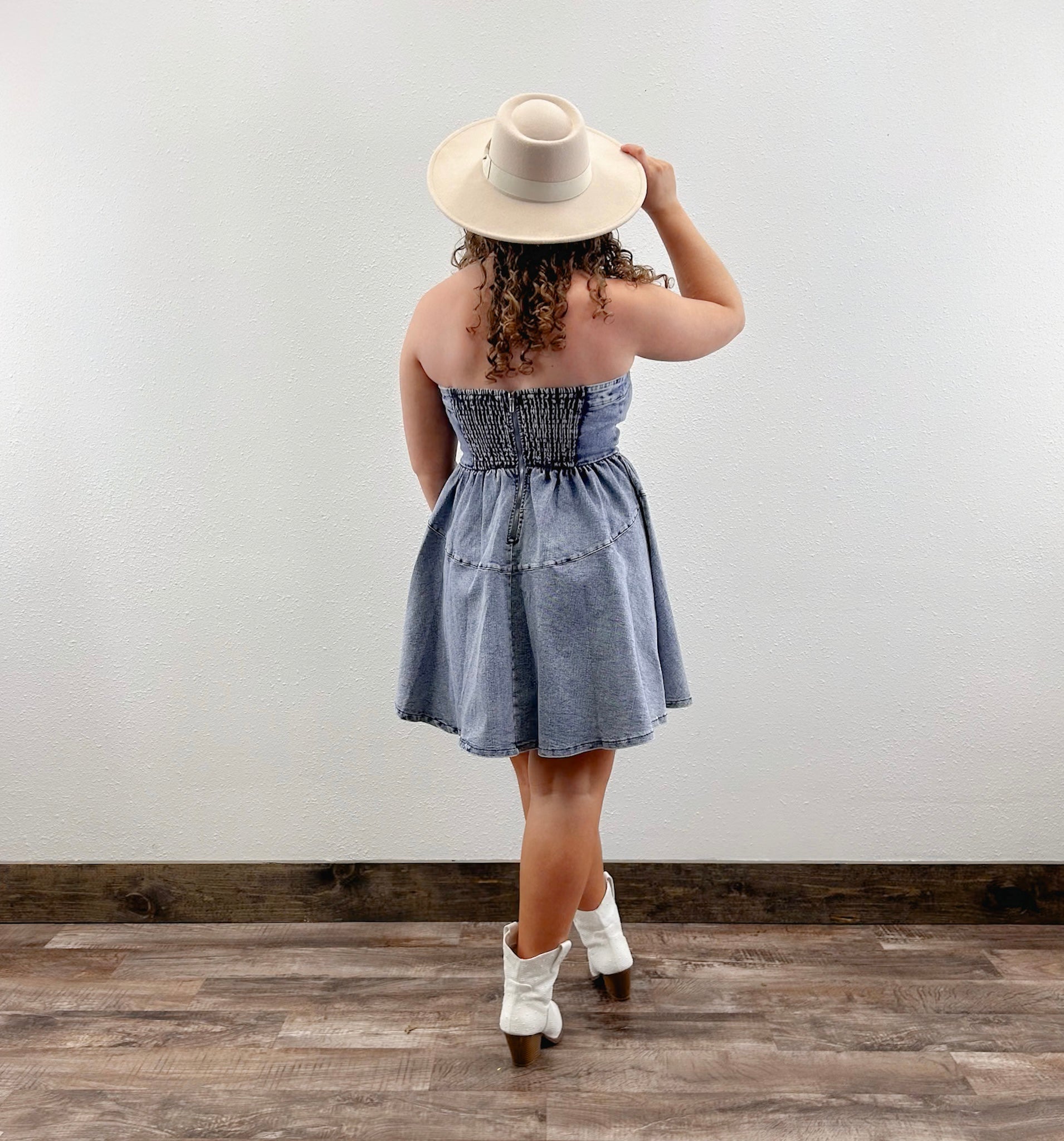 This stylish and figure-flattering strapless mini dress features multiple tiers of denim. Perfect for the summer, this comfortable yet cute dress is a great addition to any wardrobe.
