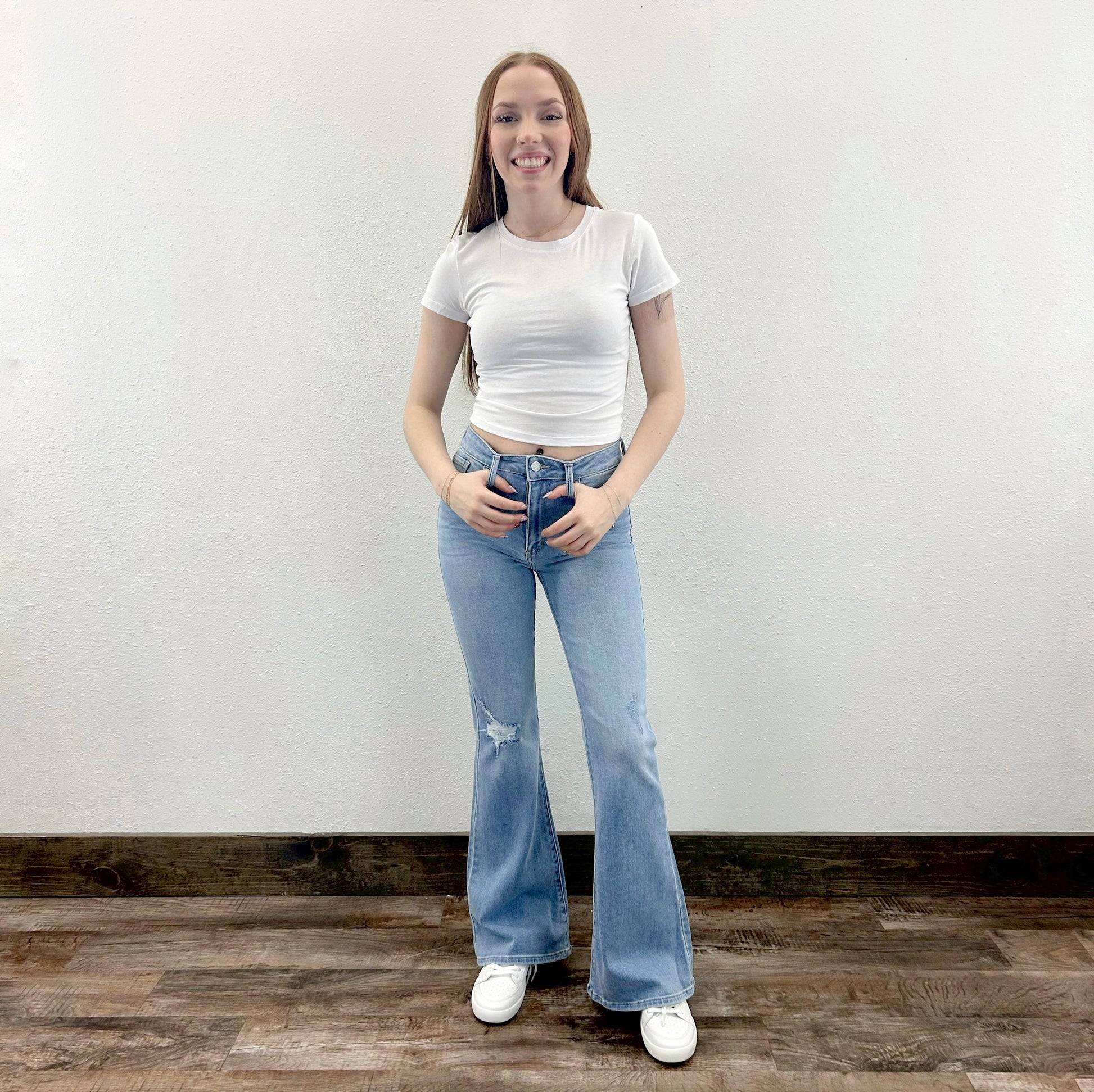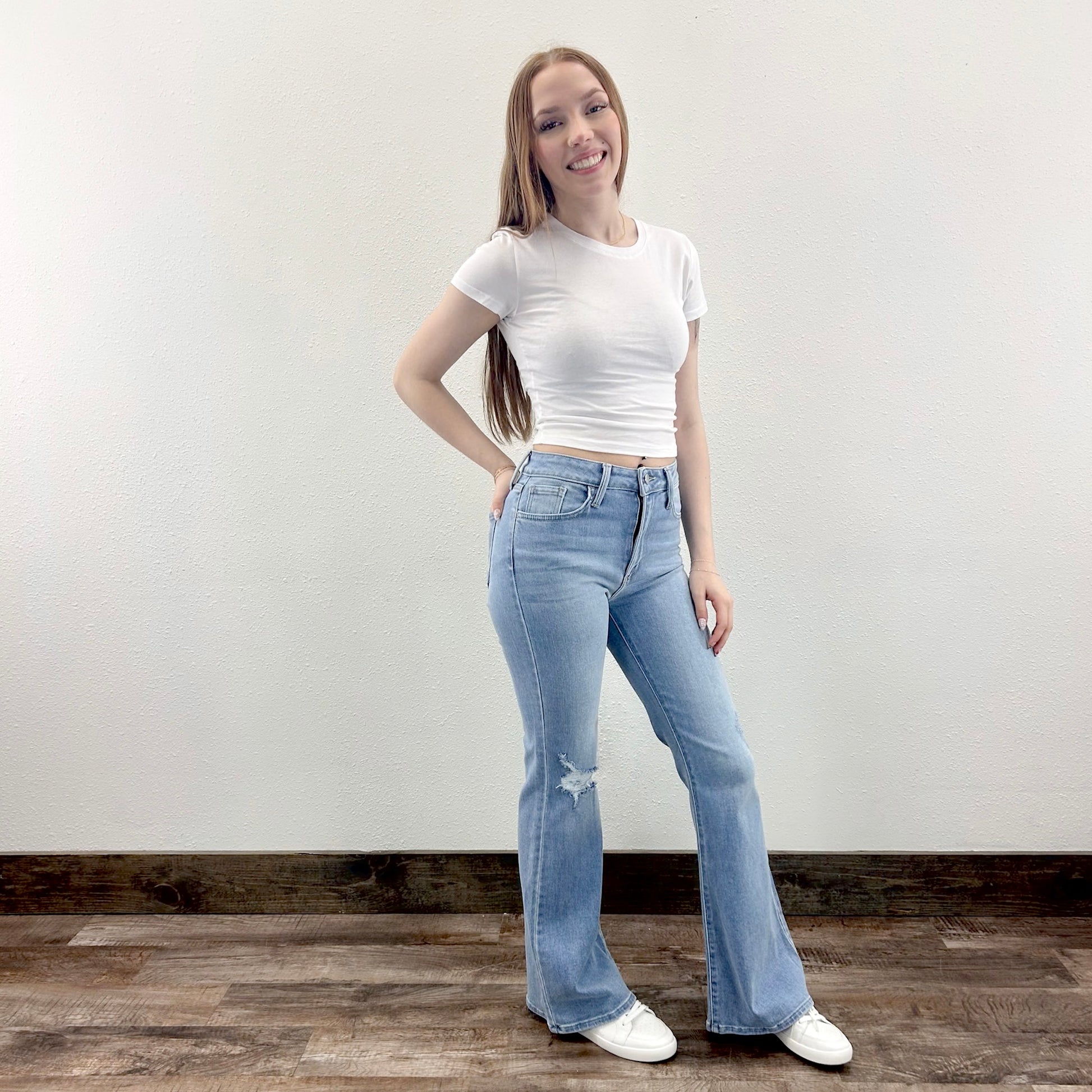 Crafted from high-quality Just Black Denim, these Distressed Flare jeans feature a unique light one knee distressed design. The flare cut creates a flattering silhouette while the distressed detailing adds a trendy touch. Made with expert precision, these jeans are sure to become a staple in your wardrobe.