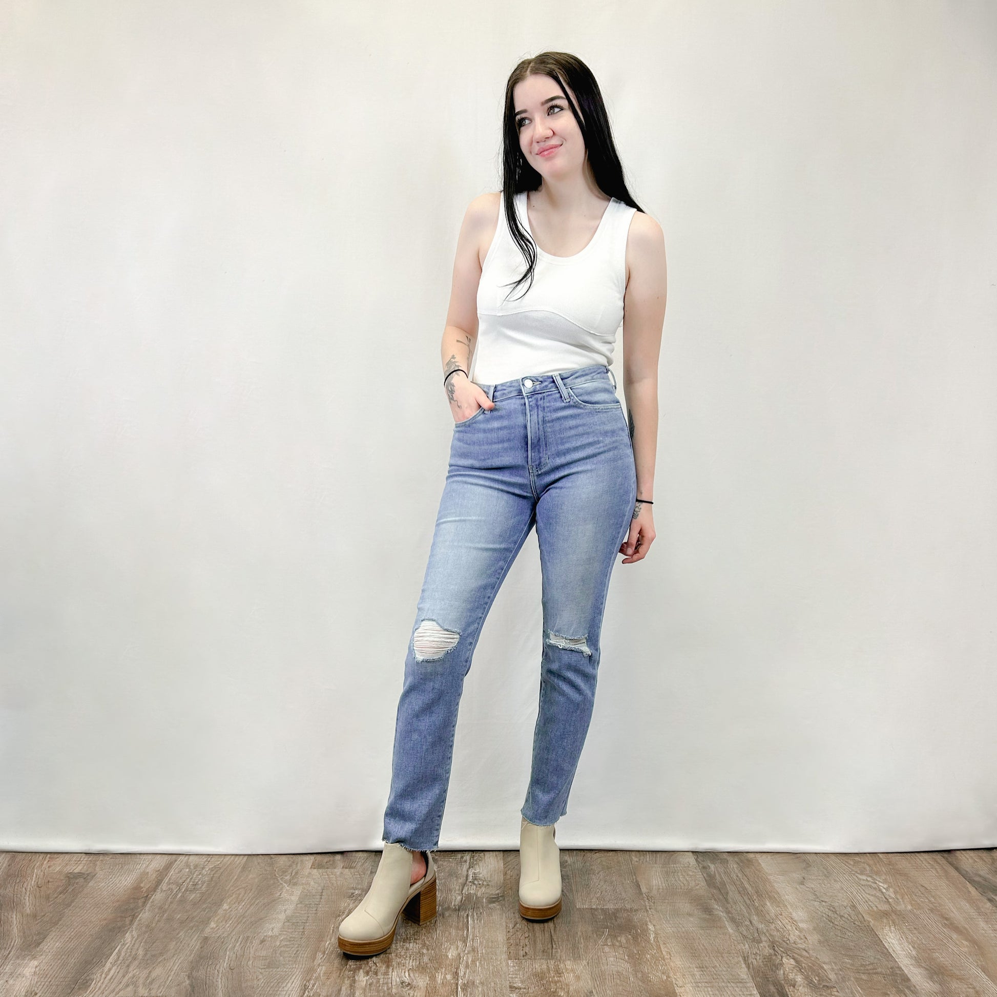 These "Just Black Denim" skinny jeans have a 28" inseam, slim, flattering fit, and stylish distressing at the knees. The distressed details add a modern edge to this classic silhouette, giving you a timeless look with a modern touch.
