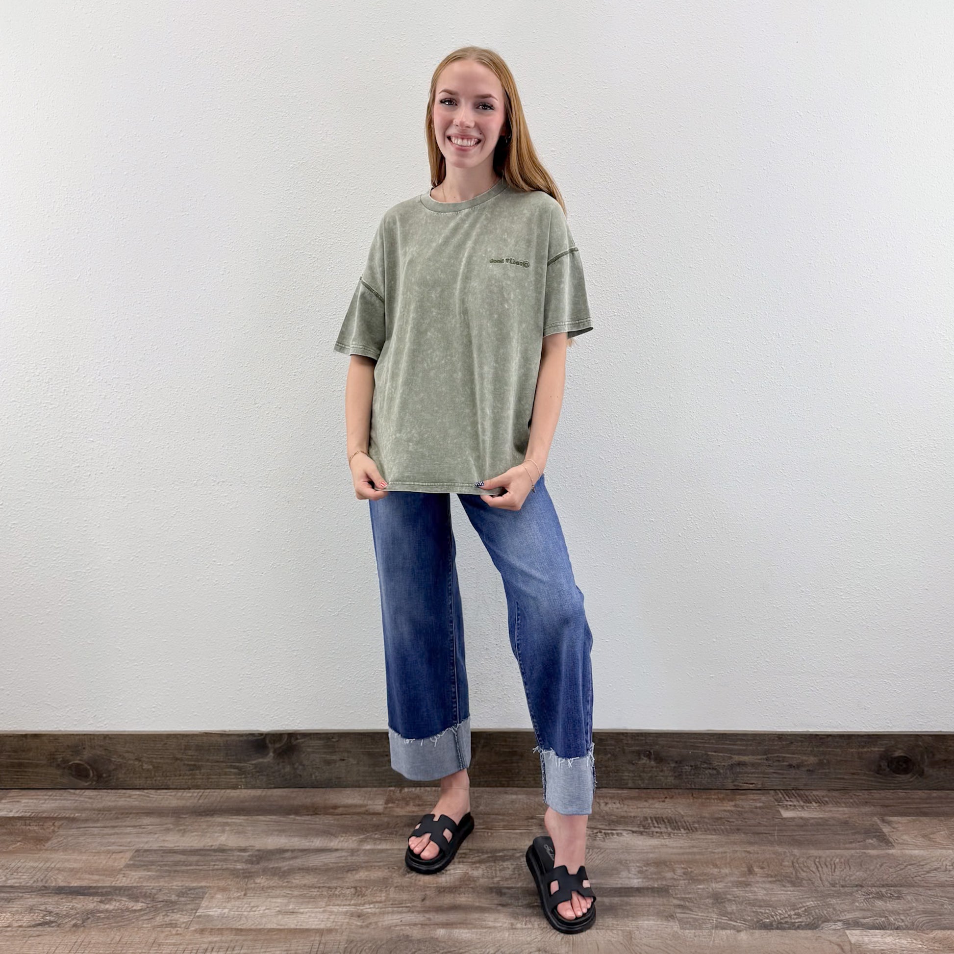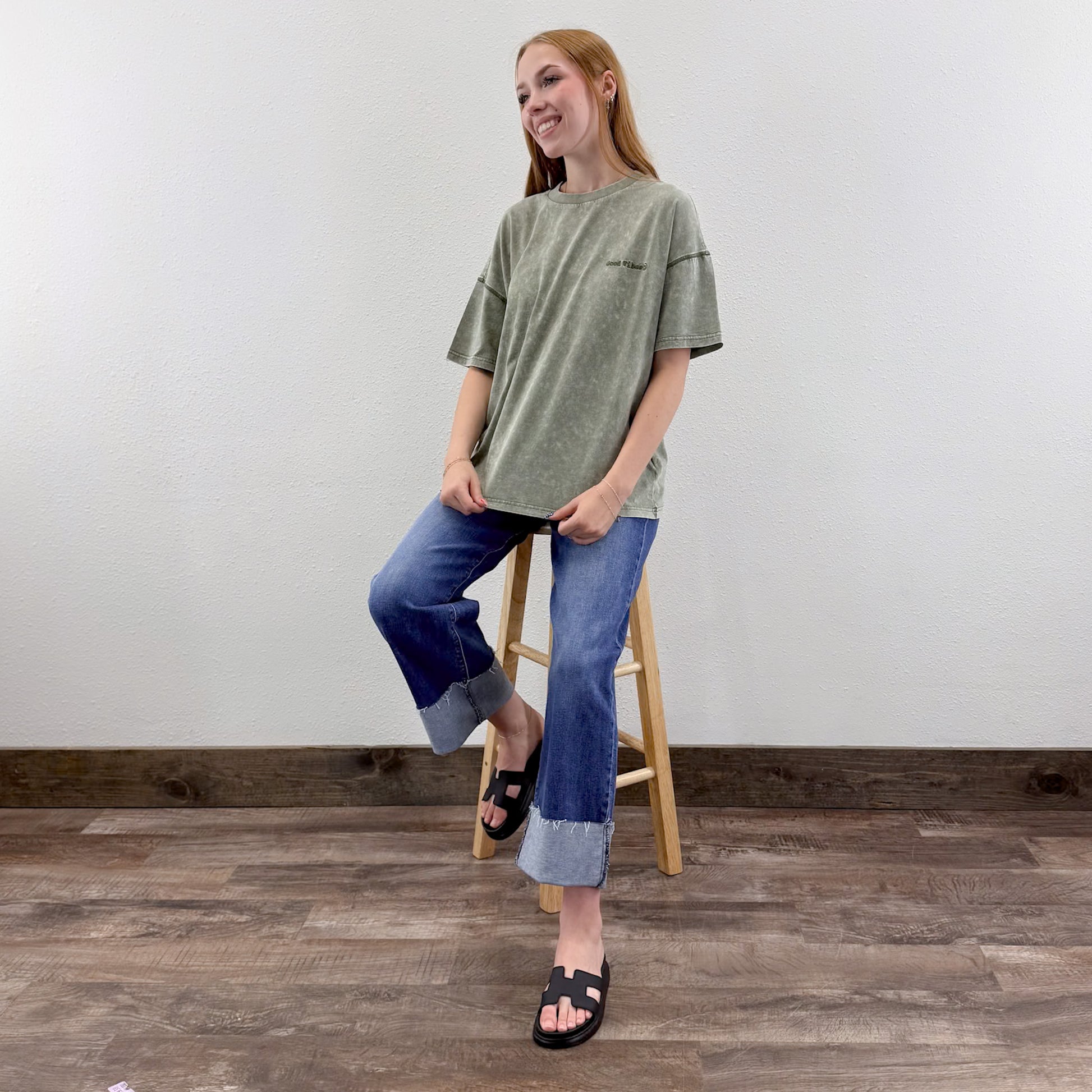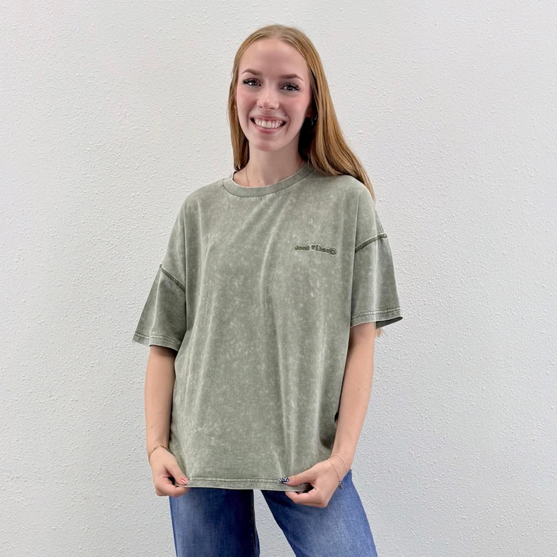 This short sleeve knit tee features a unique acid wash finish for a vintage-inspired look. A subtle "Good vibes" embroidery adds a refined touch, making it perfect for casual wear with a stylish edge. The soft knit fabric ensures comfort throughout the day.