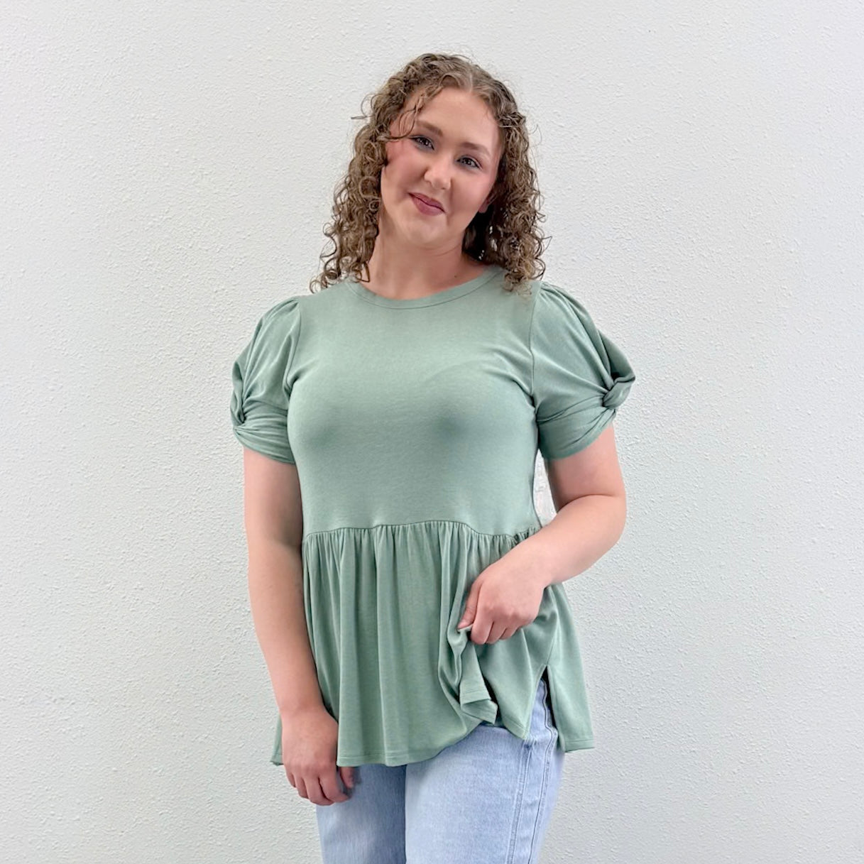 This mint peplum top features elegant puff sleeves and a stylish twist detail, creating a flattering silhouette that enhances your natural shape. Crafted for comfort and ease, its design balances sophistication with everyday wearability, making it a versatile addition to your wardrobe. Perfect for pairing with tailored pants or skirts, this top offers a polished look suitable for both professional and casual settings.