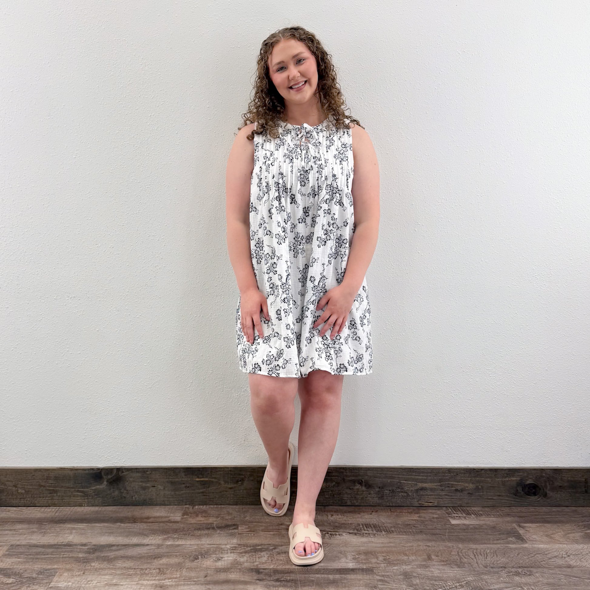 This sleeveless mini dress features delicate pintuck detailing on the front, adding subtle texture and sophistication. Designed with practicality in mind, it includes a convenient side pocket for essentials. Its tailored fit and lightweight fabric make it an ideal choice for warm weather, combining style and functionality effortlessly.