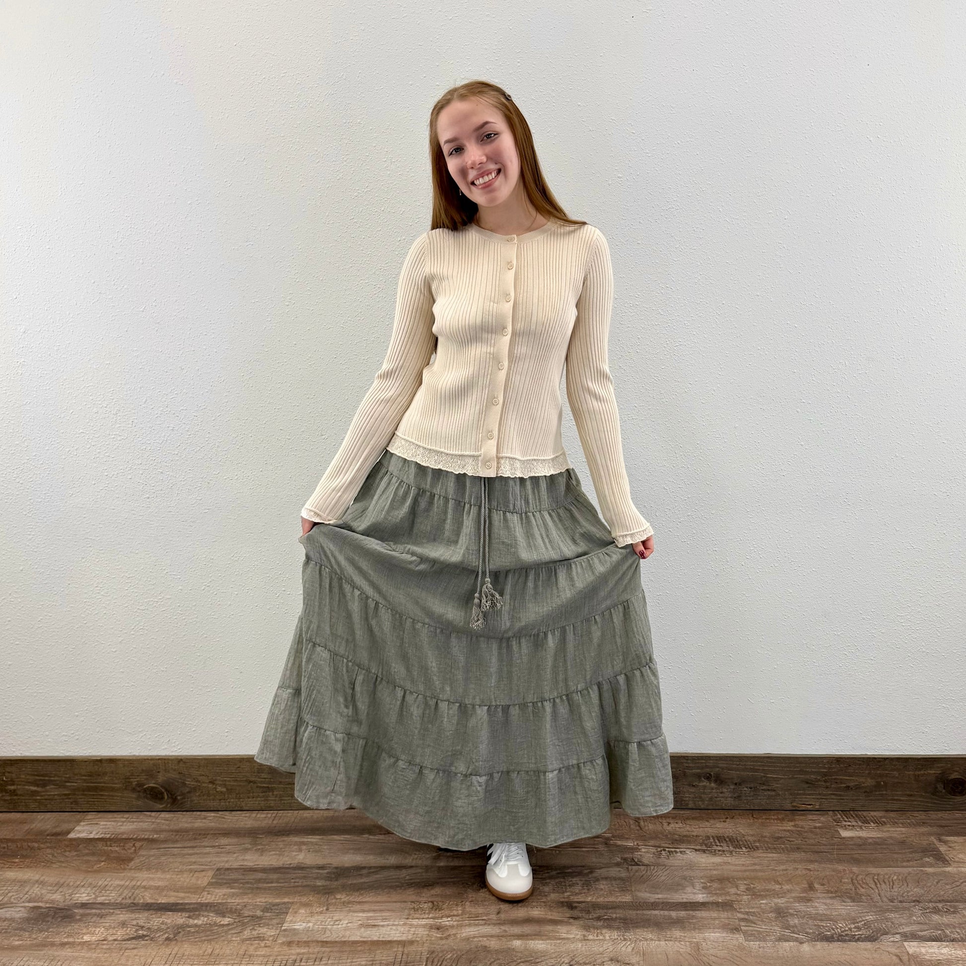 Elevate your layering game with this refined ribbed cardigan, crafted from natural fibers for a timeless aesthetic. The structured ribbed knit provides shape and durability, while delicate lace detailing adds an unexpected touch of sophistication. The button-down front allows for effortless styling—wear it open as a chic layer or buttoned for polished warmth. Perfect for transitional seasons, this versatile piece pairs seamlessly with everything from casual basics to elevated essentials.