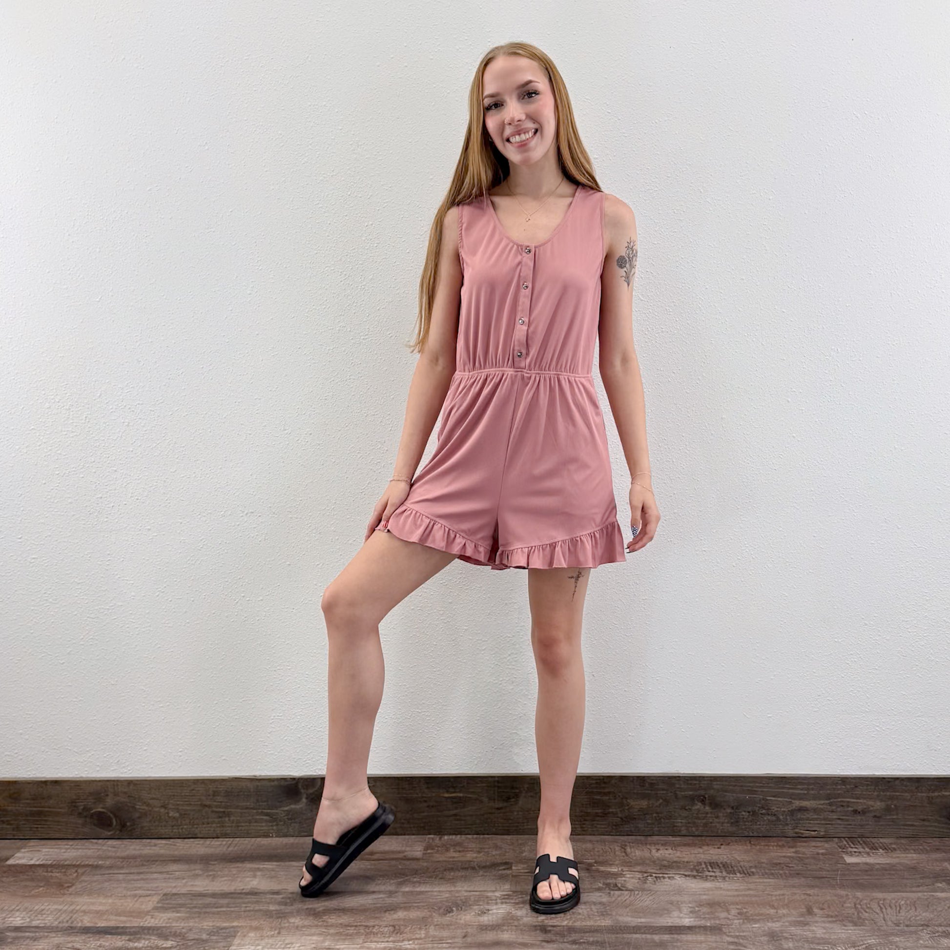 This sleeveless romper features a front button-down design and a delicate ruffle hem, combining effortless style with comfortable wear. Ideal for warm weather, its lightweight fabric and flattering silhouette make it a versatile addition to any wardrobe, perfect for casual outings or relaxed gatherings.