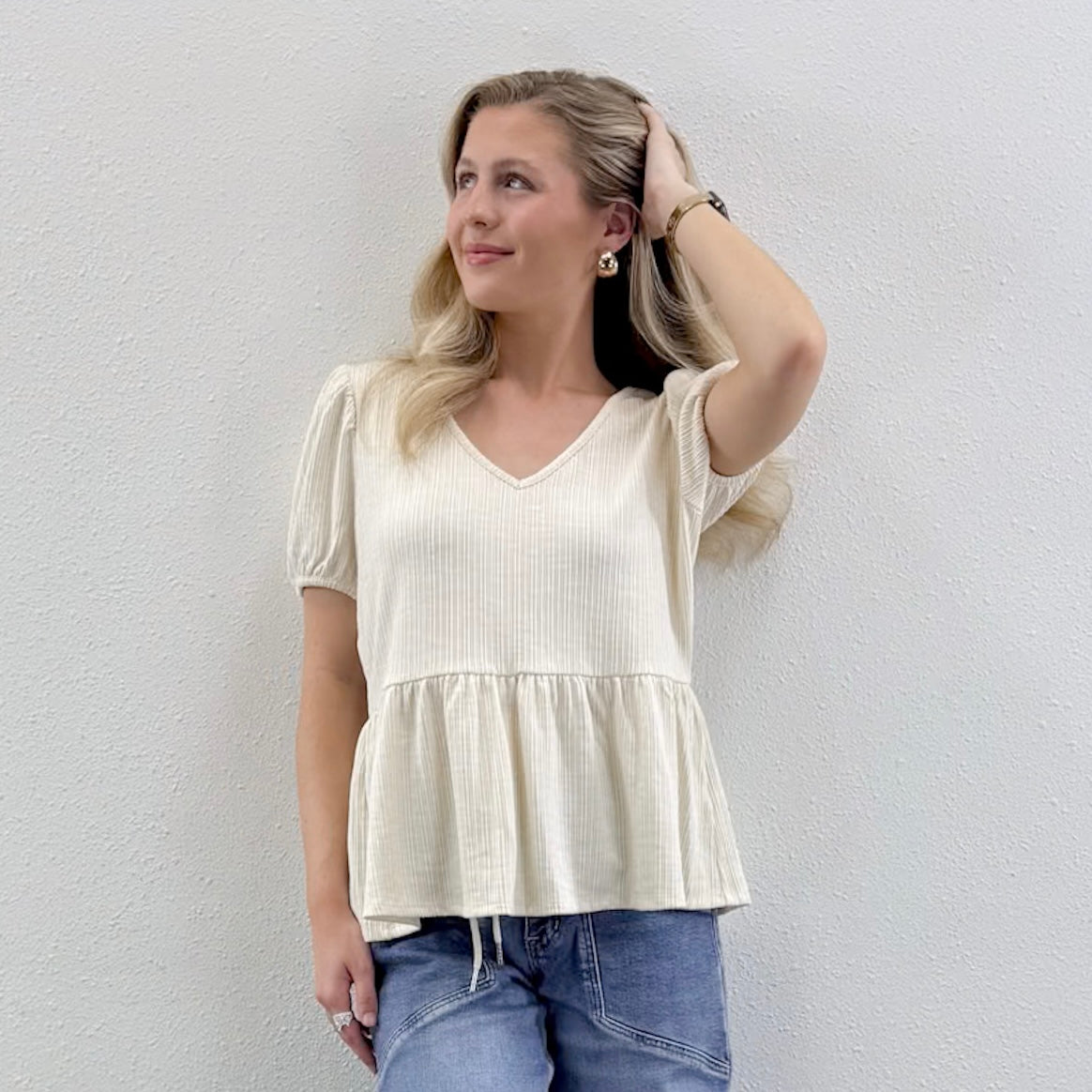 This Slub Babydoll Top features a textured ribbed fabric with a flattering V-neckline and stylish puffed short sleeves. Its relaxed babydoll silhouette offers comfortable wear while adding a touch of feminine charm. Ideal for layering or wearing on its own, this top combines casual ease with subtle sophistication.