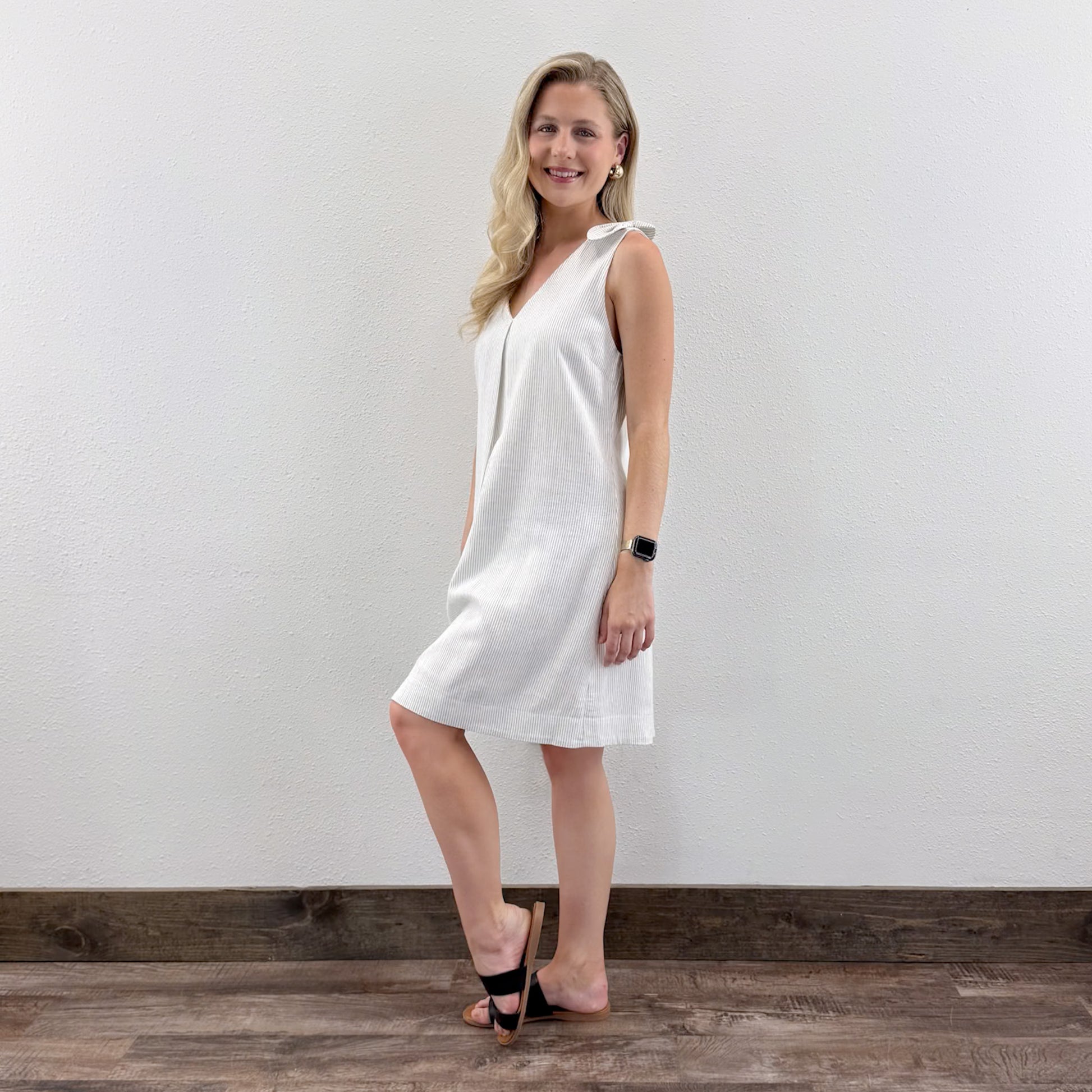 This off-white mini dress features a sophisticated striped pattern crafted from a breathable linen blend. Its double V-neck design adds a modern, flattering touch, making it ideal for warm weather or layered styling. The lightweight fabric ensures comfort while maintaining a polished look suitable for both casual and semi-formal occasions.