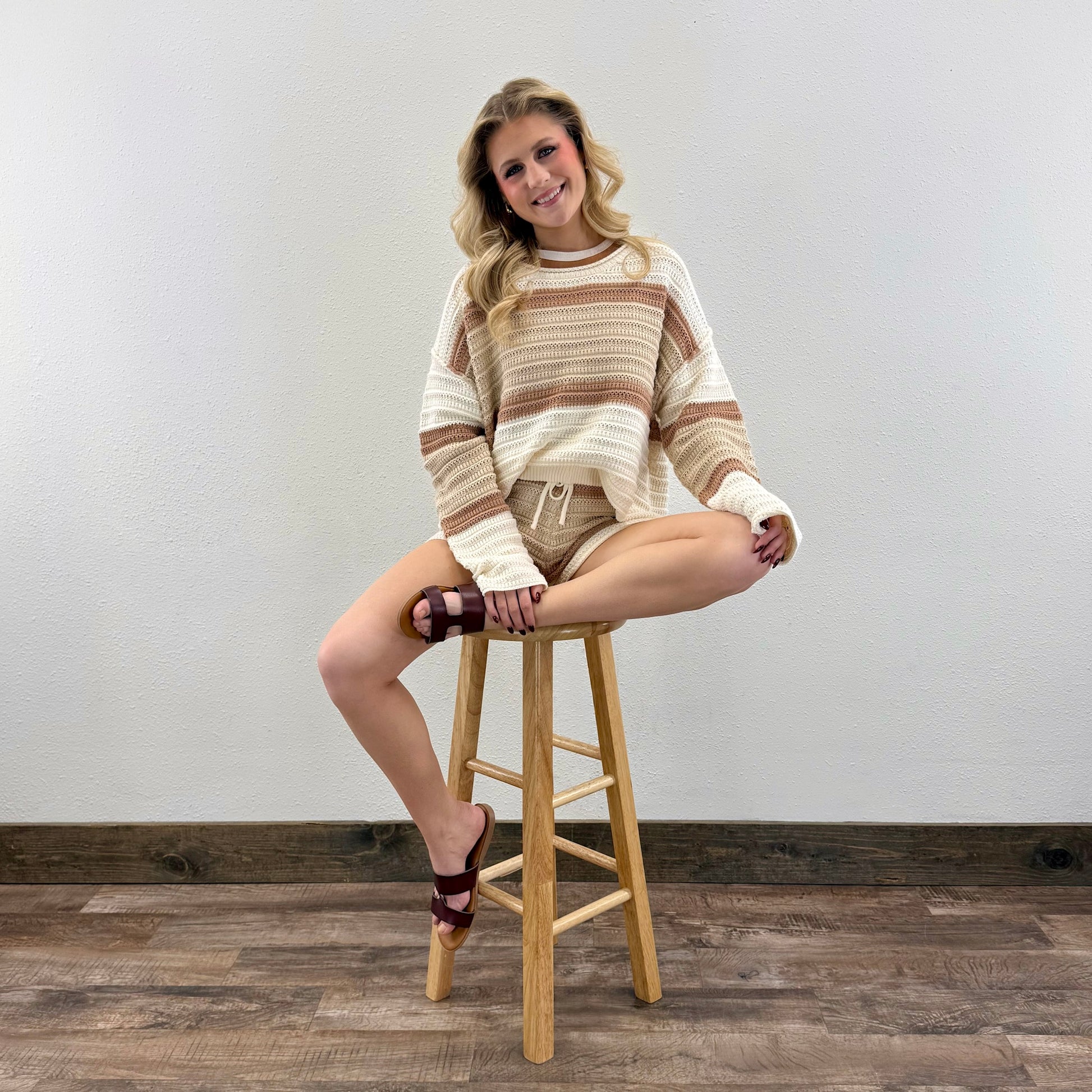 Elevate your wardrobe with this sophisticated striped crochet top, expertly crafted with intricate openwork detailing and long sleeves for versatile layering. The textured knit construction offers breathable comfort while the classic stripe pattern provides timeless appeal. Perfect for transitional seasons, this piece pairs effortlessly with fitted basics or flowing skirts for polished, intentional styling. The structured long sleeves add dimension and coverage, making it an essential addition to any refined casual collection.